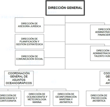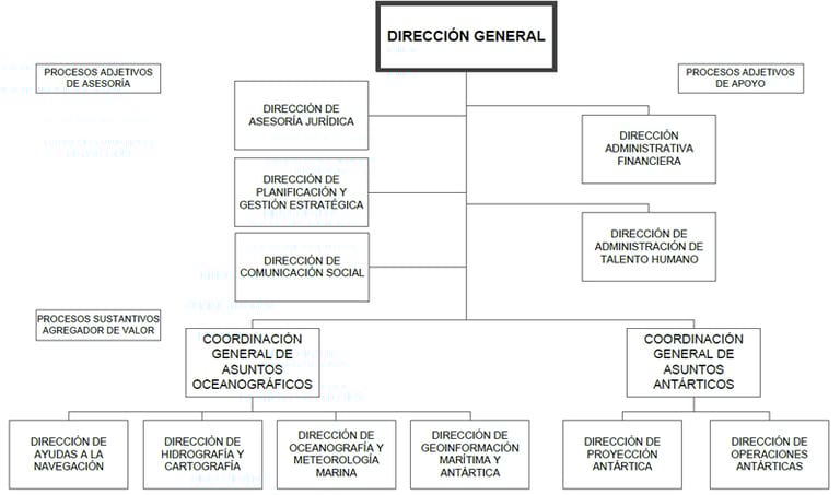 Misión: Dirigir, coordinar, articular y evaluar las diferentes actividades técnicas ejecutadas en las áreas de ayudas a la navegación, hidrografía, cartografía, oceanografía, geofísica, meteorología marina y gestión de la geoinformación, mediante el ejercicio del liderazgo e implementación de políticas y estrategias internas de gestión y control, a fin de contribuir con los diferentes productos y servicios generados para garantizar la seguridad a la navegación, el desarrollo, defensa y soberanía de los espacios marítimos jurisdiccionales del Ecuador.